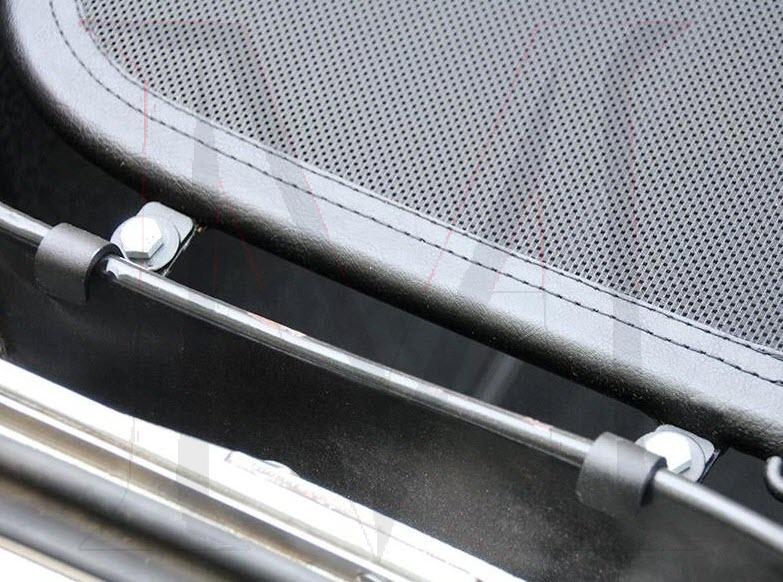 AVAIL 4-5 DAYS FROM GERMANY METAL FRAMED, FINE BLACK MESH SCREEN MOUNTED BEHIND SEATS ATTACHED TO SOFT TOP COMPARTMENT LID TO REDUCE DRAFTS AND WIND NOISE. ALLEVIATES BACK DRAFT AND WIND BLOWN LOOK. EASILY REMOVED AND FOLDS FOR EASY STORAGE IN TRUNK.