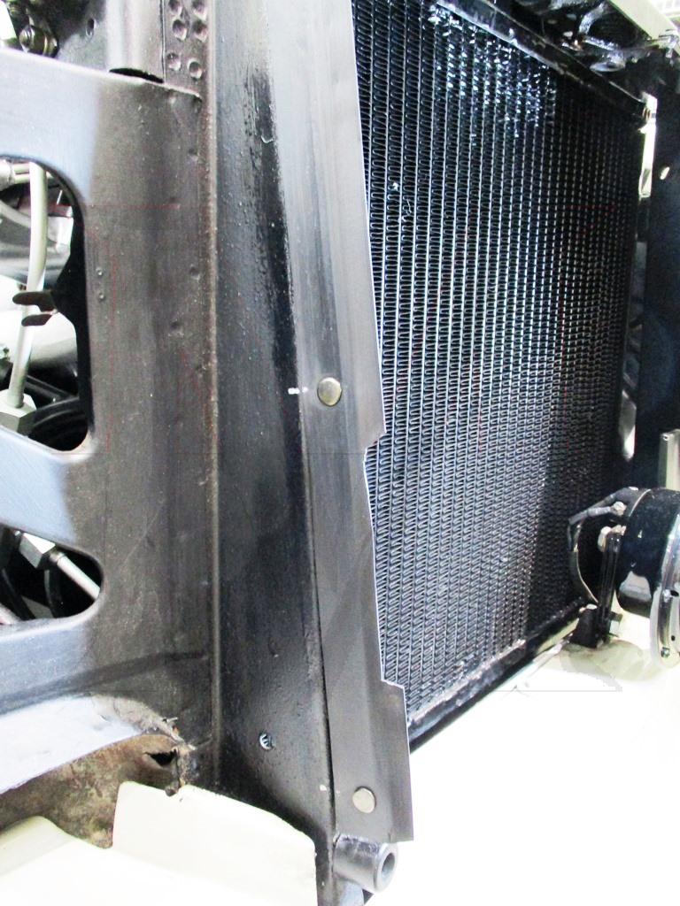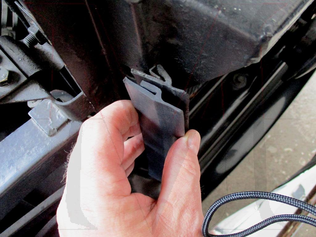 1) Remove old rubber seal strip. Rivets will have to be cut and pried off (See pictures 4 and 6). Be careful not to distort the bracket that is welded to the radiator support.